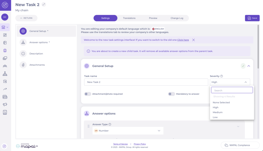 Task Severity dropdown: Allows selection of the severity level that for that task.