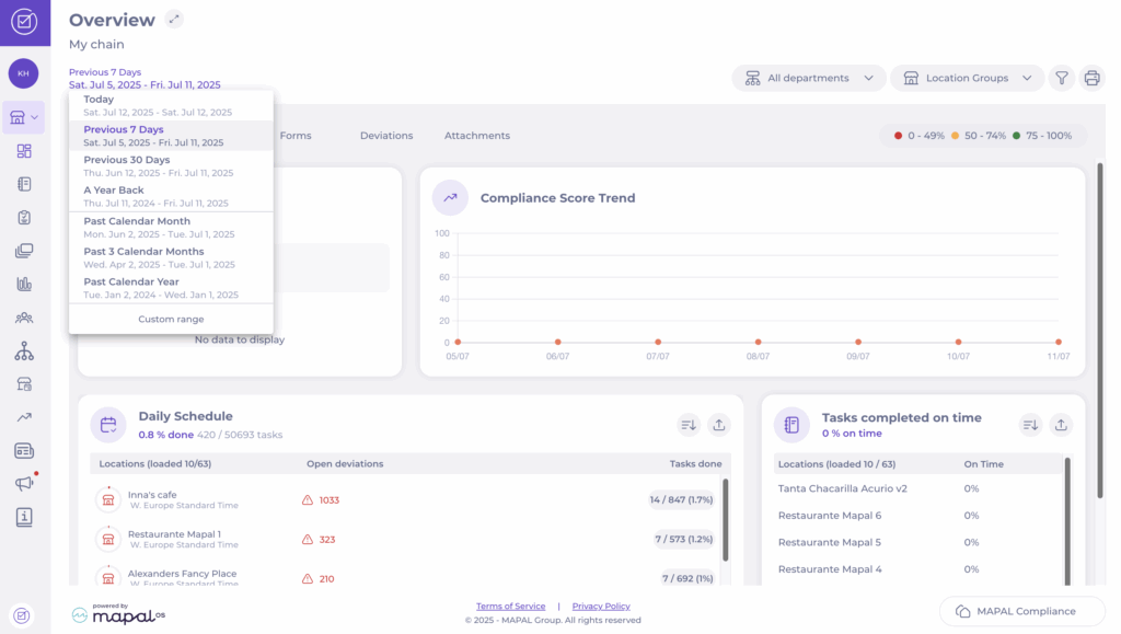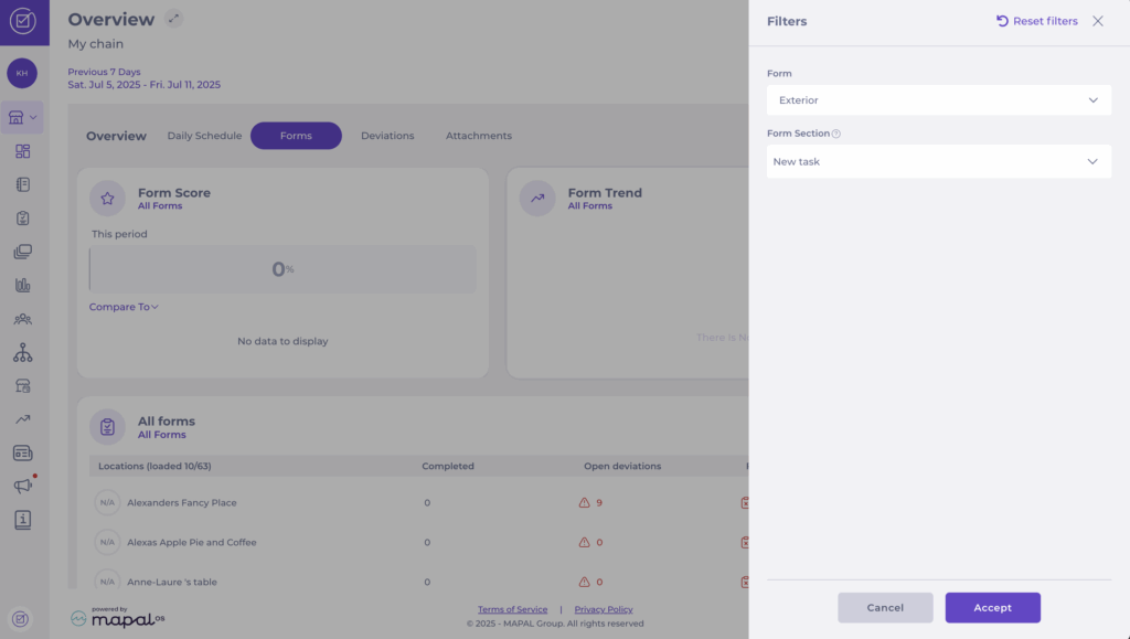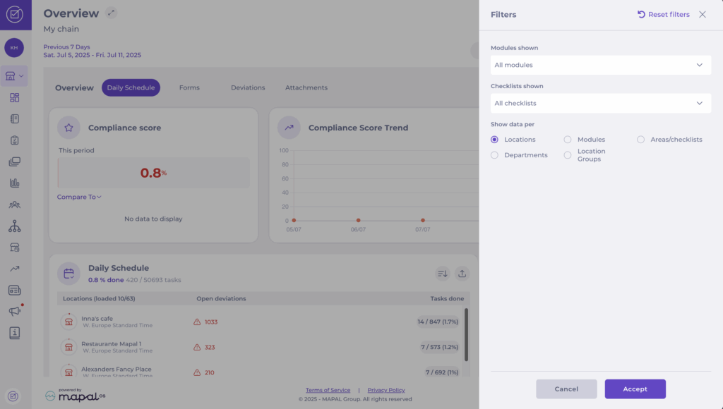 Example: If you only want to view the "Food Safety" module, set the filter to only show "Food Safety". You will then see how your units have answered the checklists connected to that module.