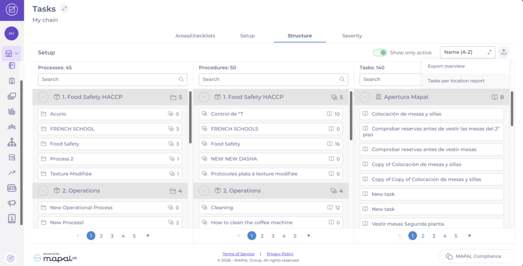 The Structure page provides a complete overview of the customer’s setup, showing how modules, processes, procedures, and tasks are interconnected. While this page does not allow edits, it enables central users to review and verify the setup for accuracy and consistency.