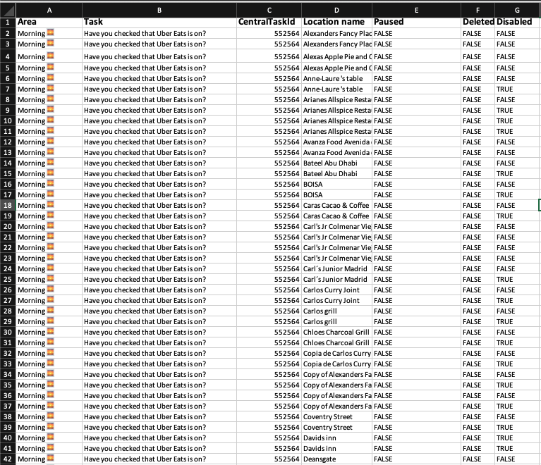 You can export a Tasks per Location report, showing which central tasks are active across each location. For every central task, the report displays the location-level status: active, paused, or deleted.