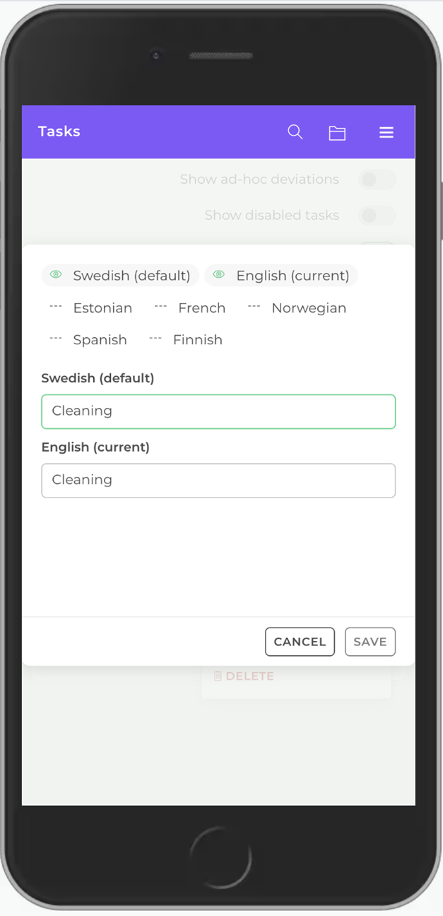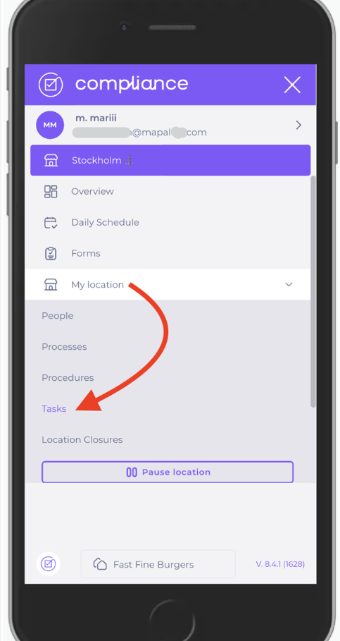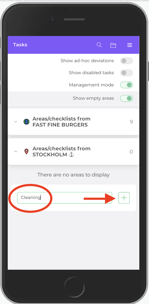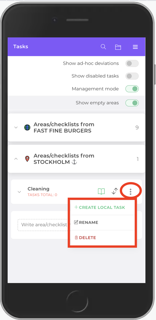 You’ll see two areas appear: the central areas containing tasks set up by your business (the globe icon), and the local areas containing tasks set up for only this specific location (the red pin).