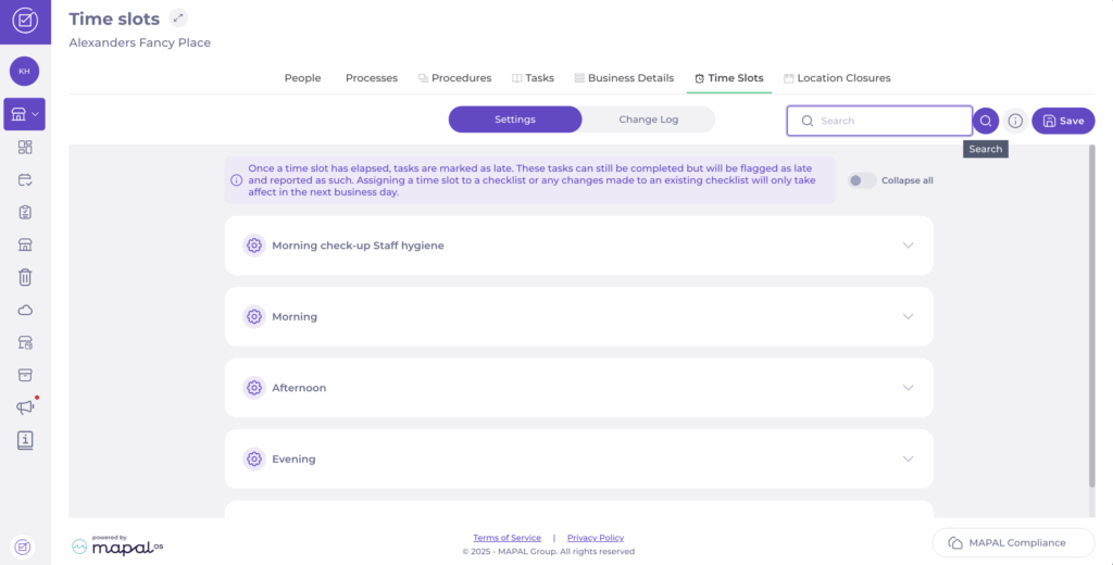 Time slots define specific periods during the day (for example, Morning, Afternoon, Evening) and determine when checklist tasks should be completed.