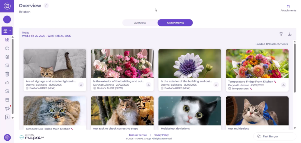 We introduced a new Attachments tab within Local Overview, giving full visibility of all supporting evidence uploaded at site level (from tasks and forms). Users can filter by date and type, preview images, download files, and scroll through attachments with full metadata.