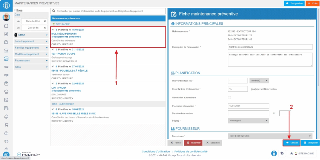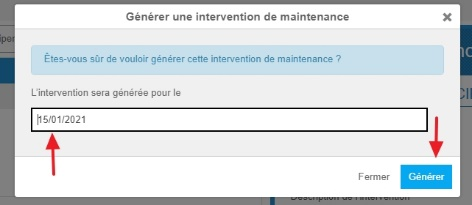 Note: It is possible to generate all upcoming preventive interventions at once. For more information, refer to the article Mass generate maintenance requests from preventive maintenance sheets.