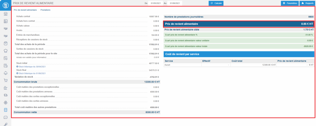 - The overall food cost price is displayed as a result. If you have entered your stock removals by specifying the service related to the removal, you will then get the details by service.