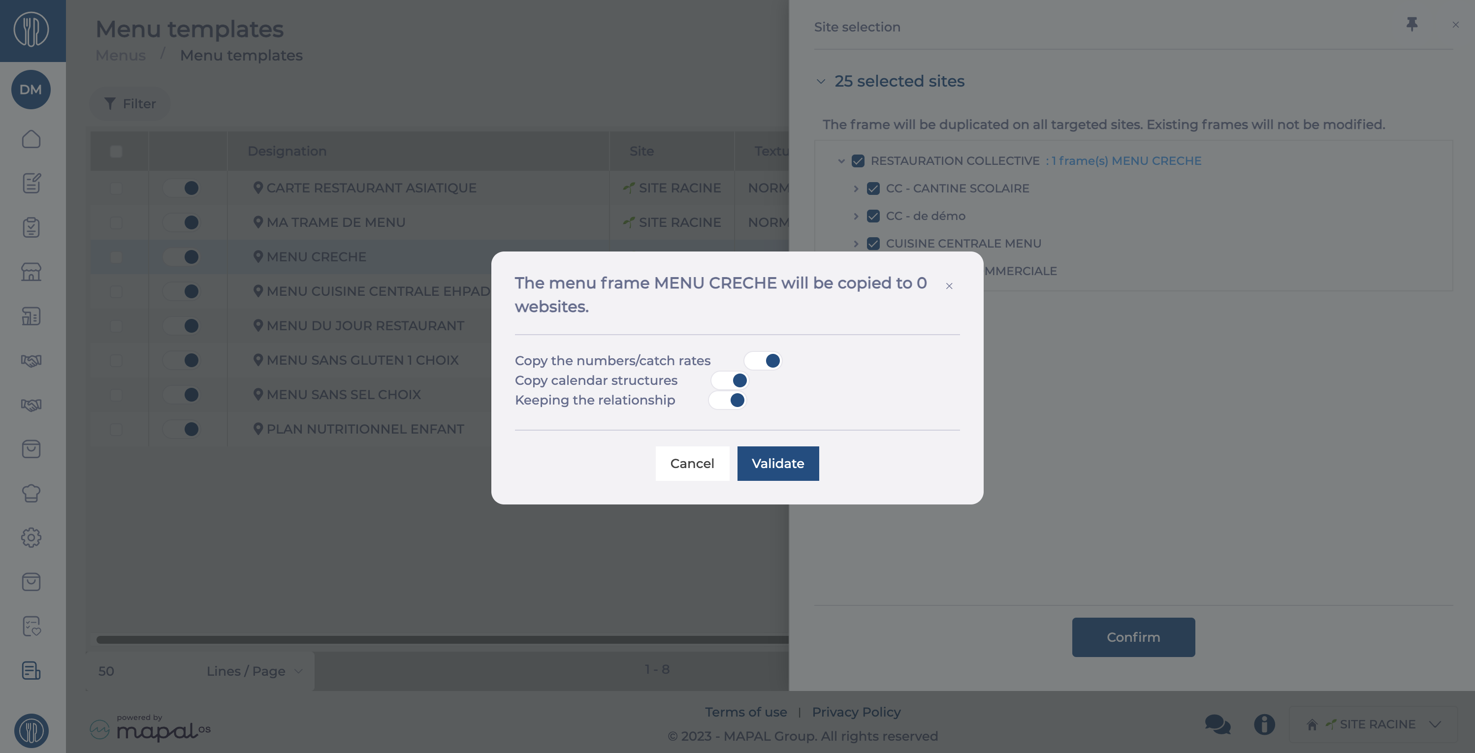- Select Validate to initialise duplication. The system creates a menu structure on the child sites.