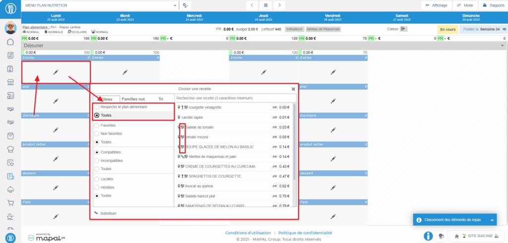 If the Ability to add dishes that do not comply with the meal plan permission is enabled on the user's profile, then they have access to the "Comply with meal plan" or "All" filter in the recipe selection window to be placed in the menu.