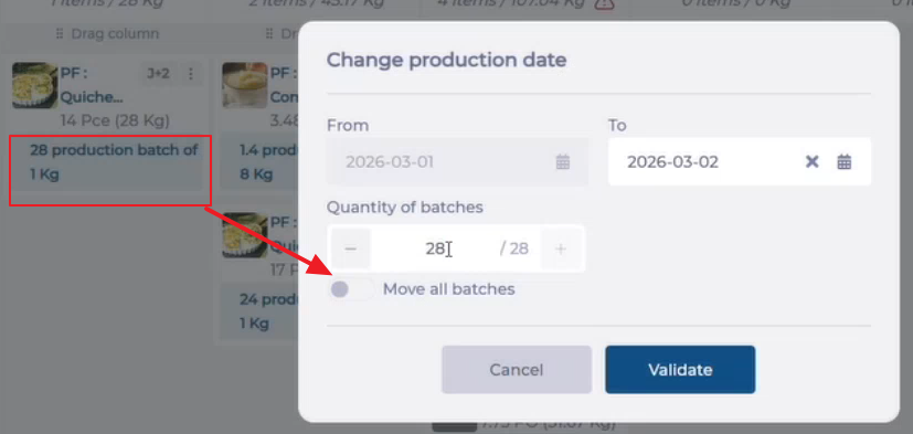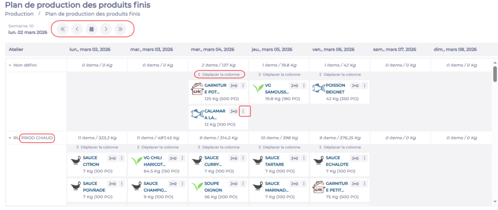 Note: If you move a recipe to a date that does not respect its shelf life, a warning is displayed at the top of the column and the recipe name appears in red.