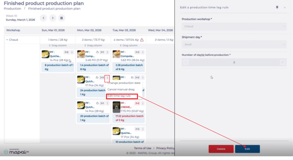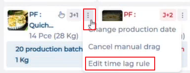 It is possible to edit a production postponement rule directly from this screen, without having to navigate to Production > Production postponement rules. If a recipe is subject to a rule, the Edit time lag rule option appears in its … menu.