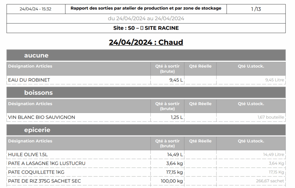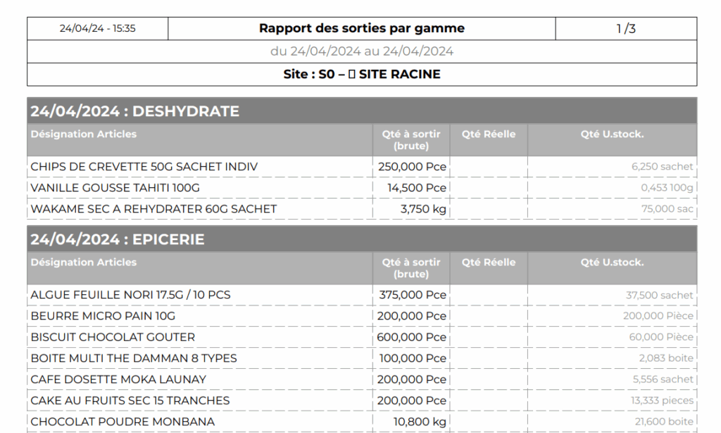 Report of withdrawals by production workshop and by range: This report allows you to generate a document to download and/or print, listing the products to be withdrawn from stock to prepare for production. This report lists the products to be withdrawn for each workshop and groups them by range.