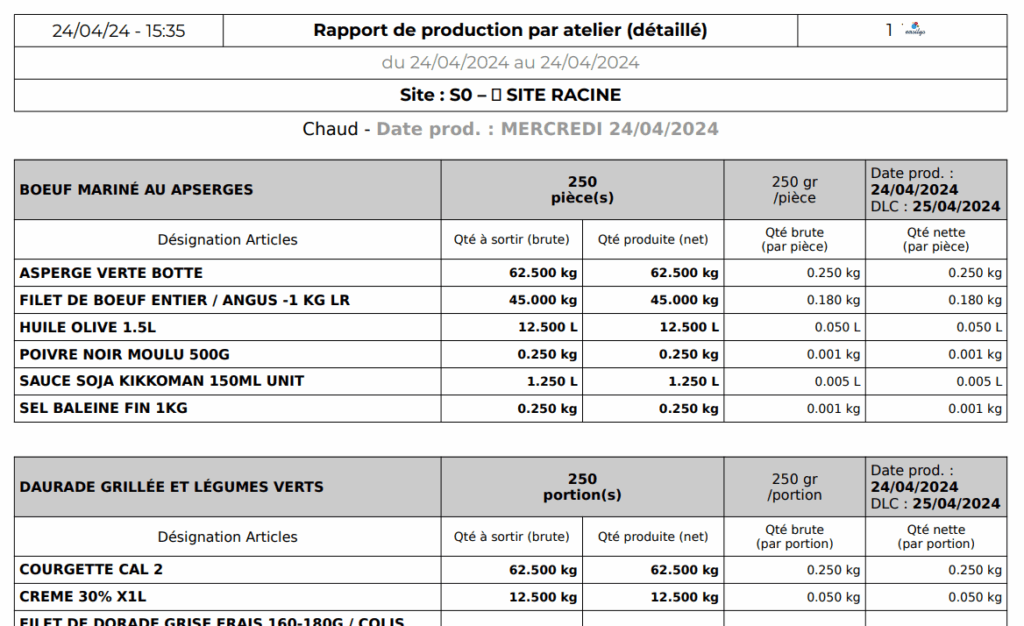 Production report by workshop (detailed): This report allows you to generate a document to download and/or print, listing for each workshop the recipes to be produced, specifying their composition.