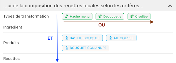 Below, it is therefore read that the Smart Rendement rule must apply if the recipe is linked to the transformation type "Hache menu"OR"Decoupage"OR"Cisellée"ANDwill apply to the industrial product "BASILIC BOUQUET"OR"AIL GOUSSE"OR"BOUQUET CORIANDRE" (if a recipe contains all three products, then it will apply to all three products).