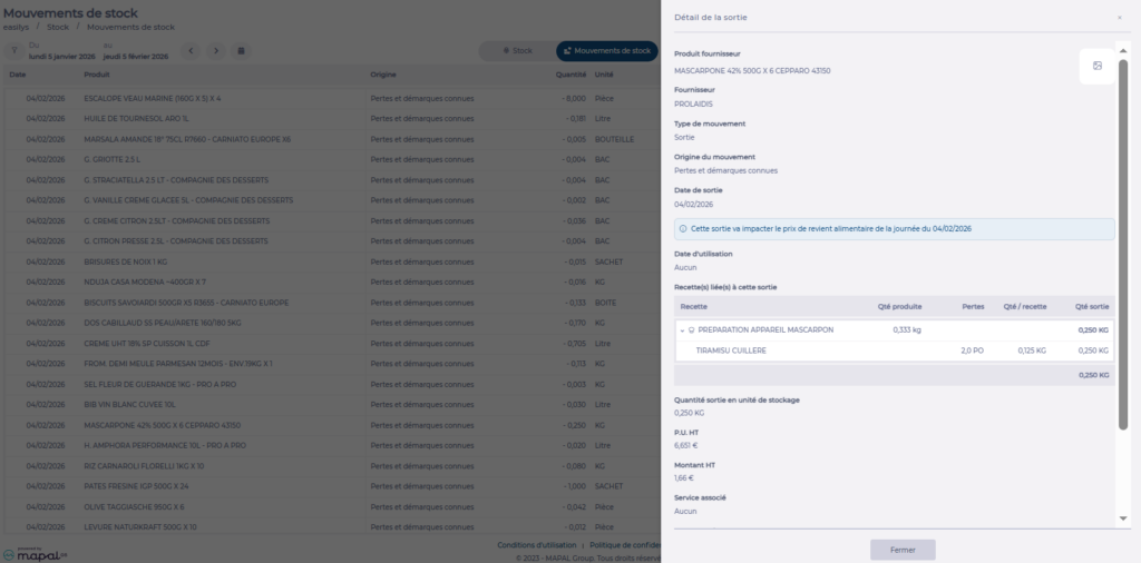 - If all or part of this deduction is not linked to a recipe loss but constitutes a direct product loss, the corresponding quantity is displayed.
