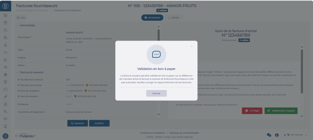 Note: When you click on Validated (Ready to Pay), you may receive a message indicating that validation is not possible due to the discrepancy in amount between the Supplier Invoice (SI) and the Invoice to Receive (ITR). The site setting Validation control for ready-to-pay invoices, available in the Invoices section of the Global Site Administration area, defines the threshold for triggering this message. Refer to the article Manage global site parameters for more information on how to access this configuration.
