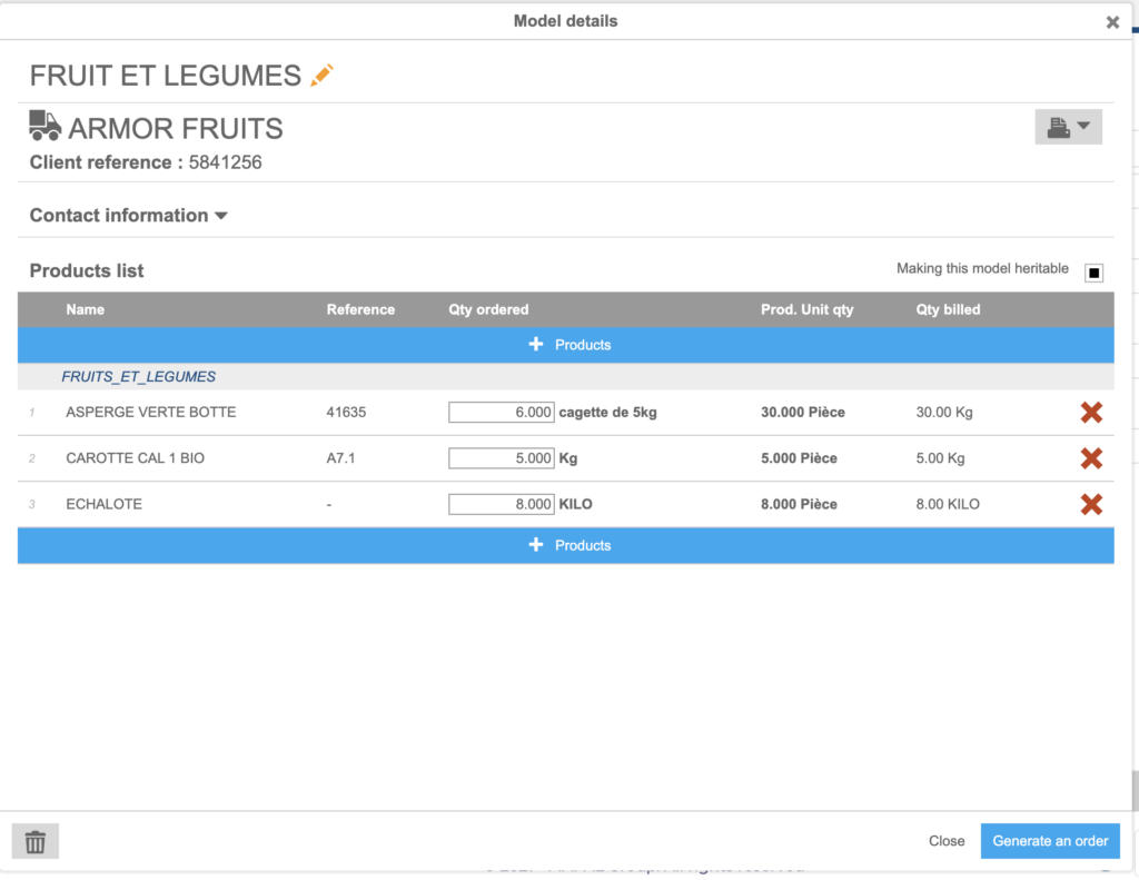 An order model enables you to quickly generate an order cart. An order model is created from an order already sent.