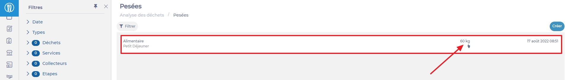 The weighing operation then appears in the list of weighing operations. The hand icon indicates manual weighing.