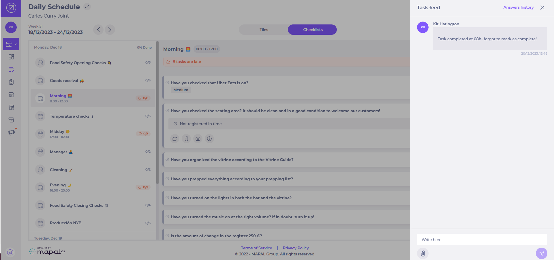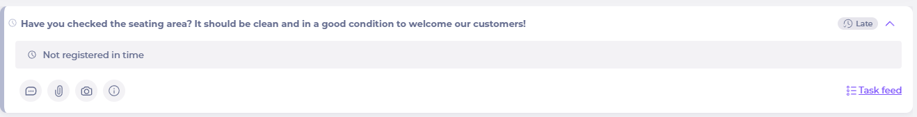 - Selecciona el área o la checklist que contiene la Tarea sin responder. Observaciones: verás un ícono de reloj de color rojo o naranja junto a las tareas atrasadas o sin completar.