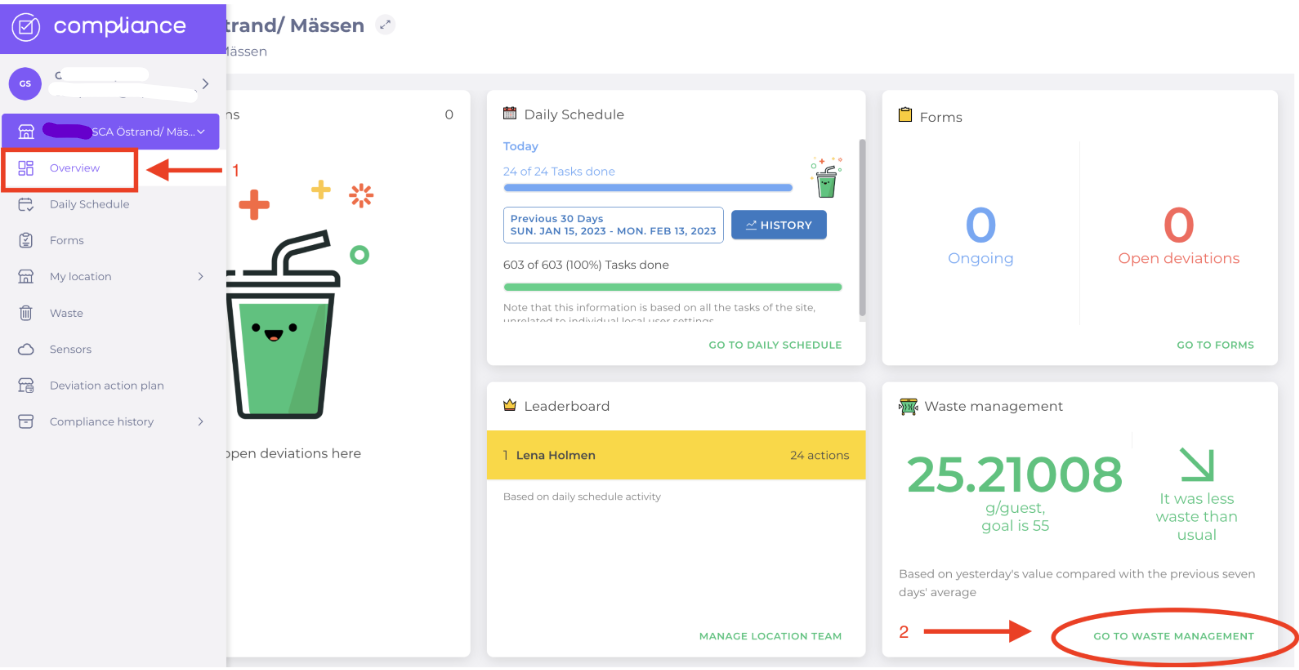 - Verás una sección llamada Gestión de residuos, que muestra el total de desperdicios en gramos por cliente y un indicador que señala si esta cantidad es superior o inferior al promedio de tu ubicación.