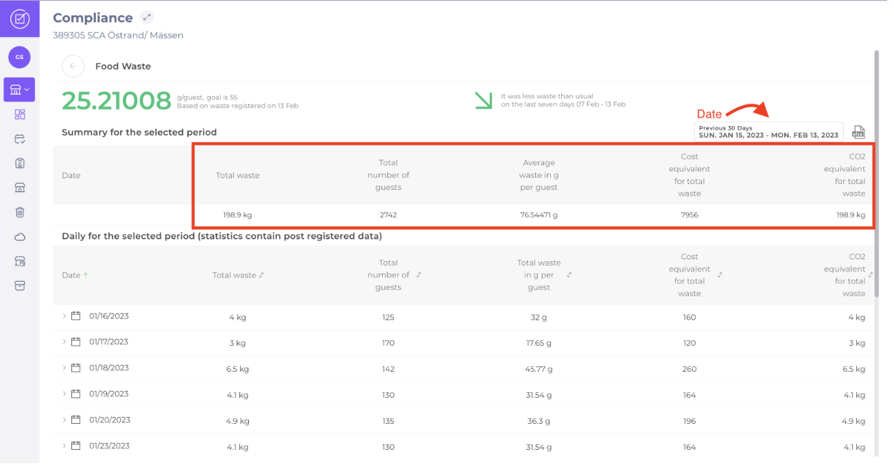 - La tabla de desperdicios mostrará un resumen del período seleccionado y un detalle diario.