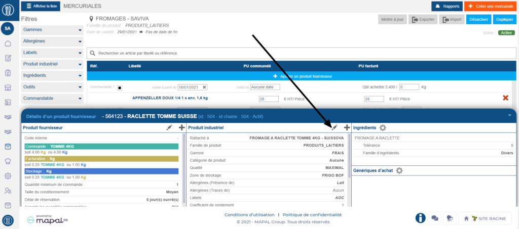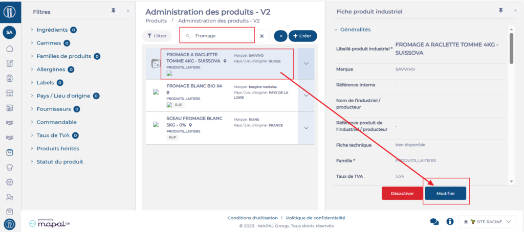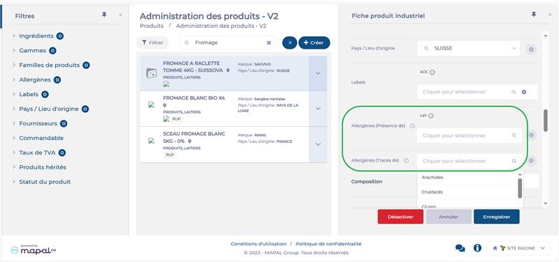En cada producto, puedes indicar si contiene alérgenos en forma de presencia o traza. Esta información se tiene en cuenta en el cálculo de la valoración de las recetas: en cada receta, puedes visualizar los alérgenos presentes, así como los riesgos de trazas, teniendo en cuenta la composición de la receta. Esta información también es visible desde los menús.