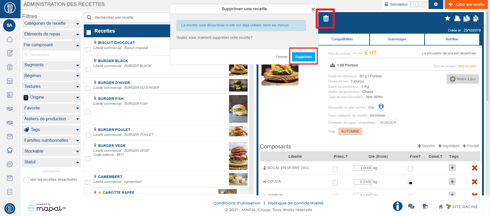 - Selecciona el icono de eliminar (papelera) a la derecha de la etiqueta de la receta.