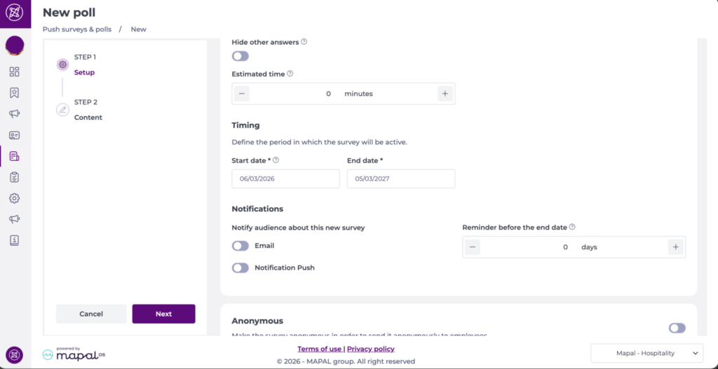 - En la sección Notificaciones, activa Correo electrónico o Notificación push para avisar a tu público cuando la votación se publique.