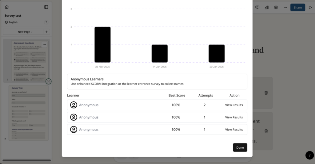 - (Opcional) Desplázate para revisar los resultados a nivel de alumno (por ejemplo, mejor puntuación e intentos) y abrir entradas individuales cuando estén disponibles.
