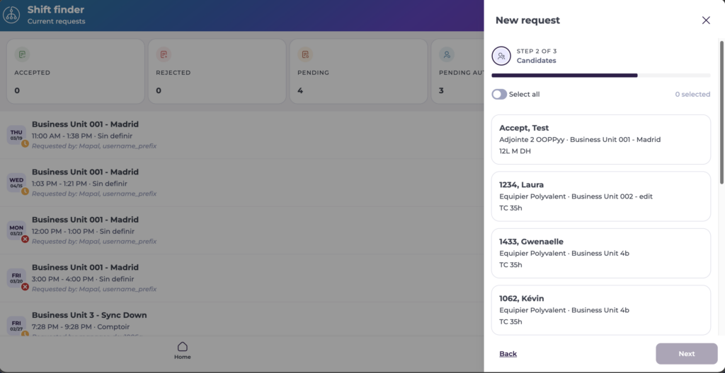 - Puedes ver los empleados elegibles en la sección Candidatos de la solicitud, y aprobar, rechazar o eliminar la solicitud desde la vista de detalle.