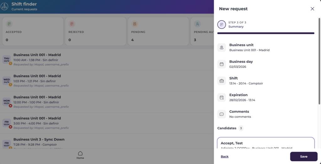 Se muestra un mensaje de confirmación y la nueva solicitud aparece en la lista de Shift Finder con el estado Pendiente.