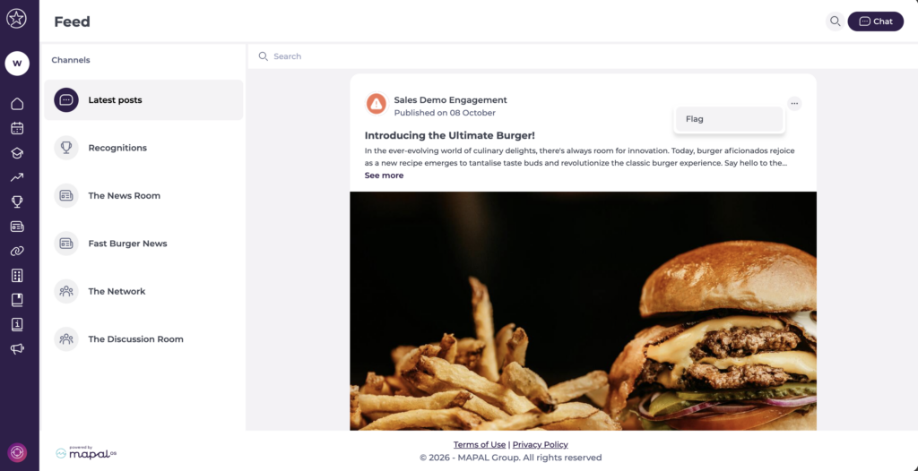 - En la pantalla de Feed, identificarás los ítems más recientes de interés en toda la empresa, divididos en diferentes canales, como publicaciones de noticias, foros, revisiones, reconocimientos y publicaciones sobre temas personalizados, como áreas de la empresa, eventos, entre otros.