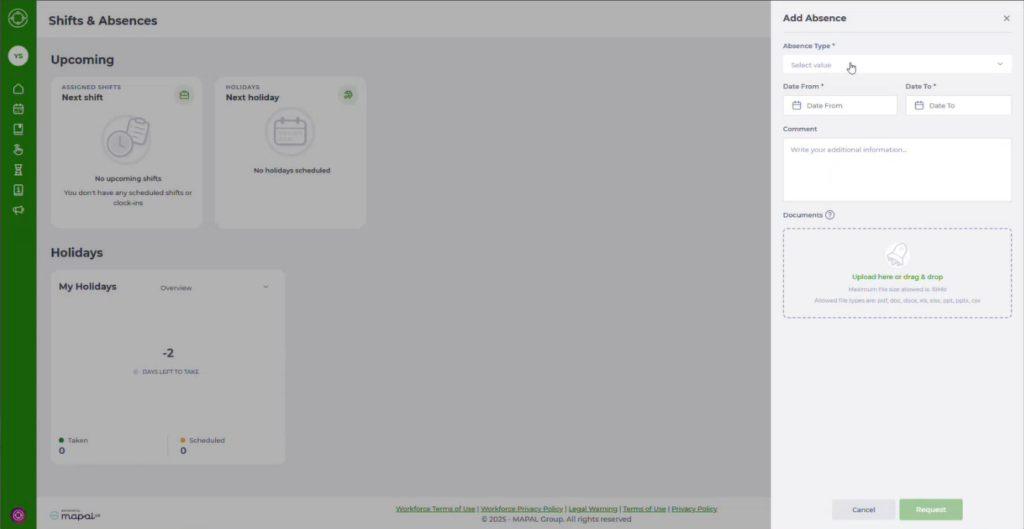- Si el tipo de ausencia requiere un justificante (por ejemplo, una baja médica), sube el documento correspondiente en el campo Documentos.