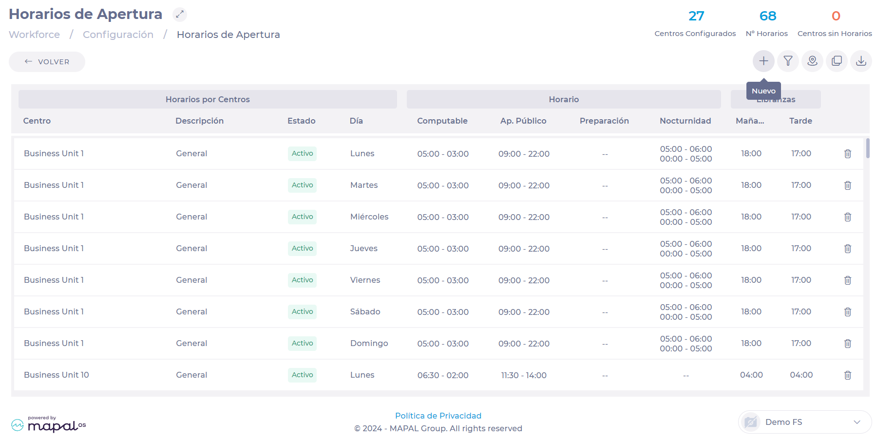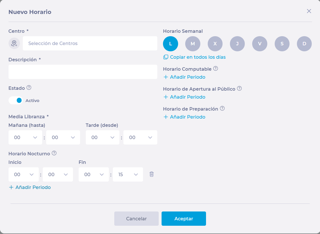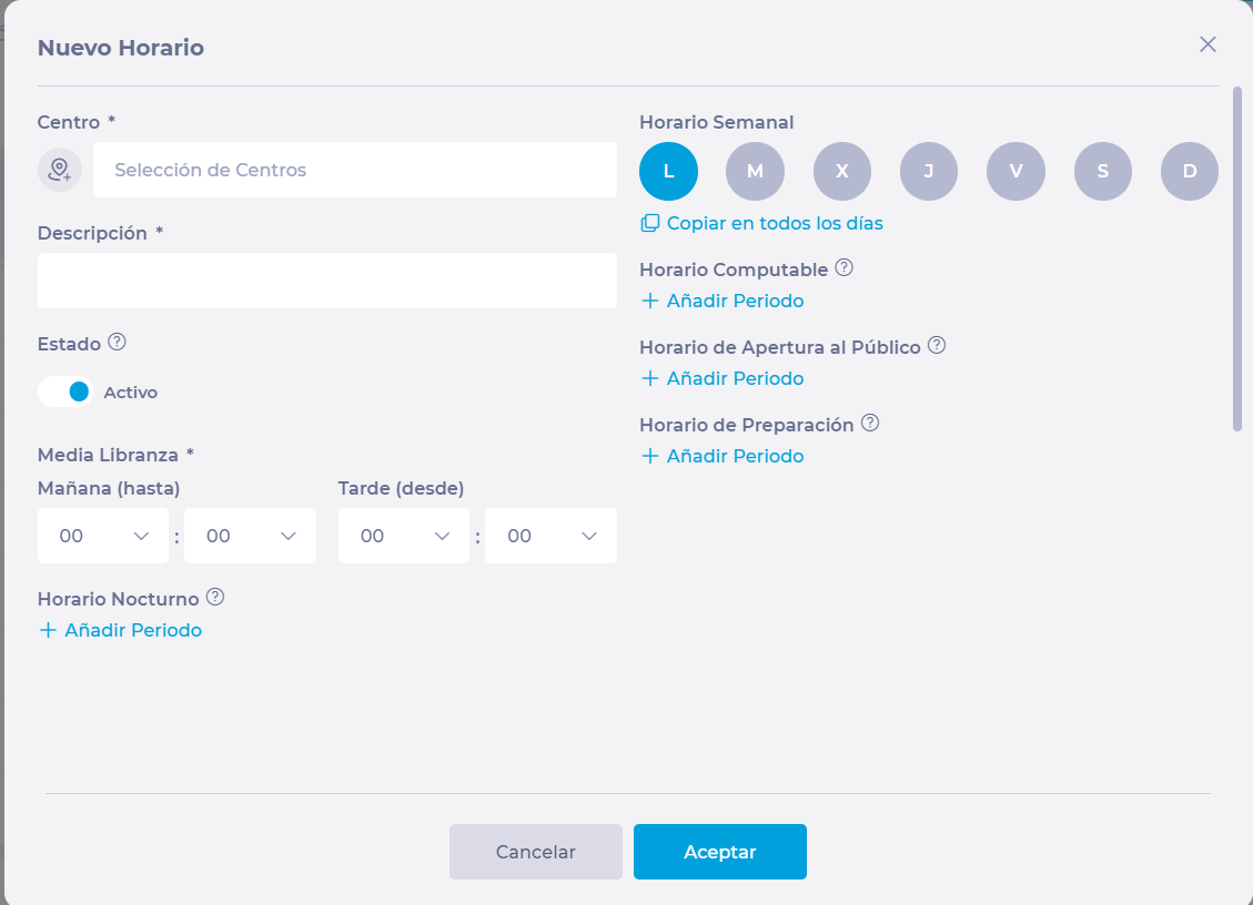 Indica las horas en las que el centro estará accesible para el cliente a través del Horario de apertura.
