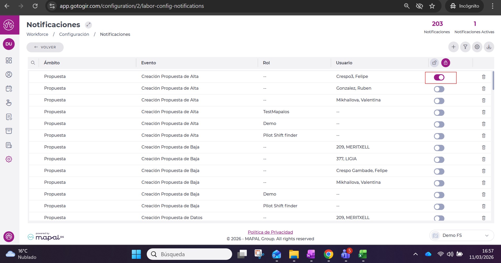 Una vez en esta pantalla, el usuario verá el listado de notificaciones ya configuradas.