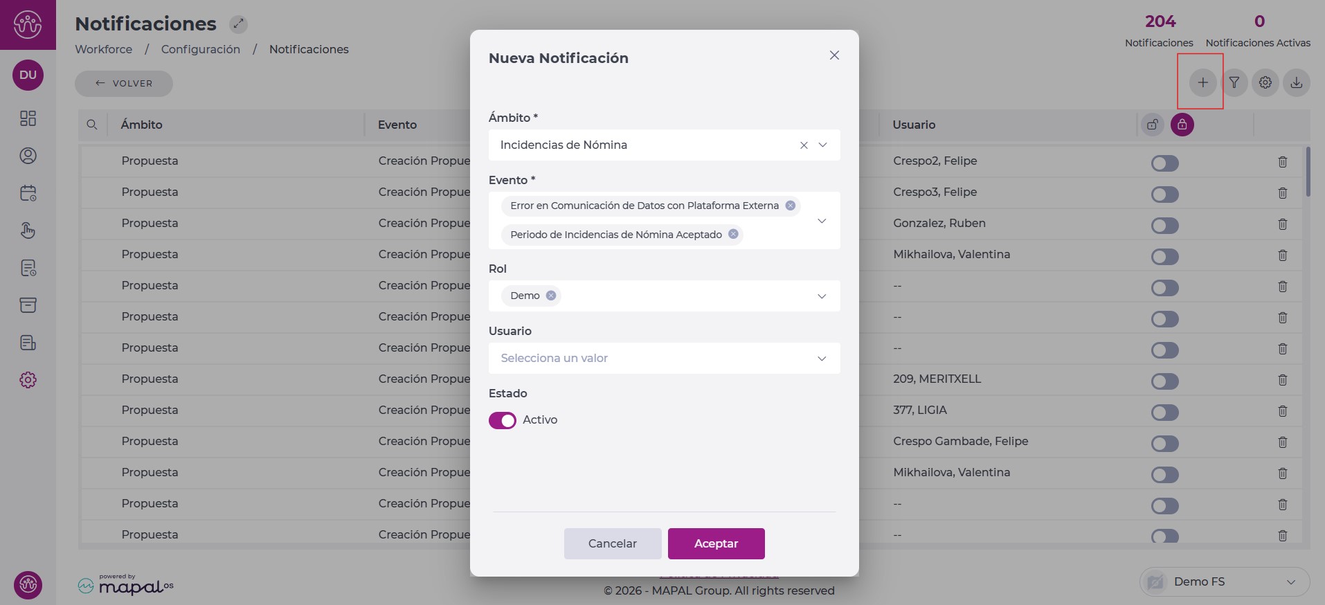 Usuario: Asocia el envío de la notificación a uno o varios usuarios específicos como destinatarios.