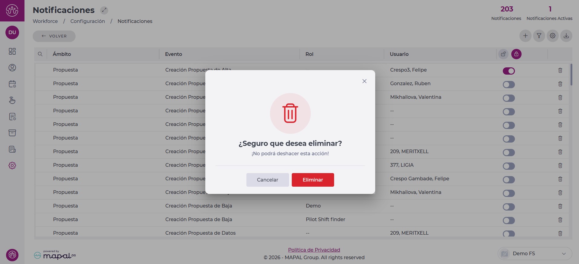 Es posible eliminar una notificación ya creada. Para ello se debe pinchar en la cesta de basura al final de la línea.