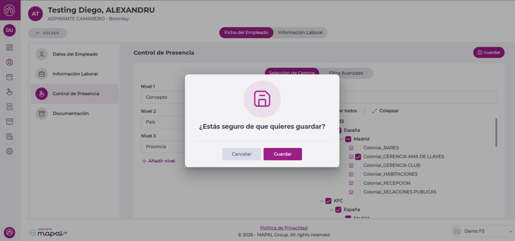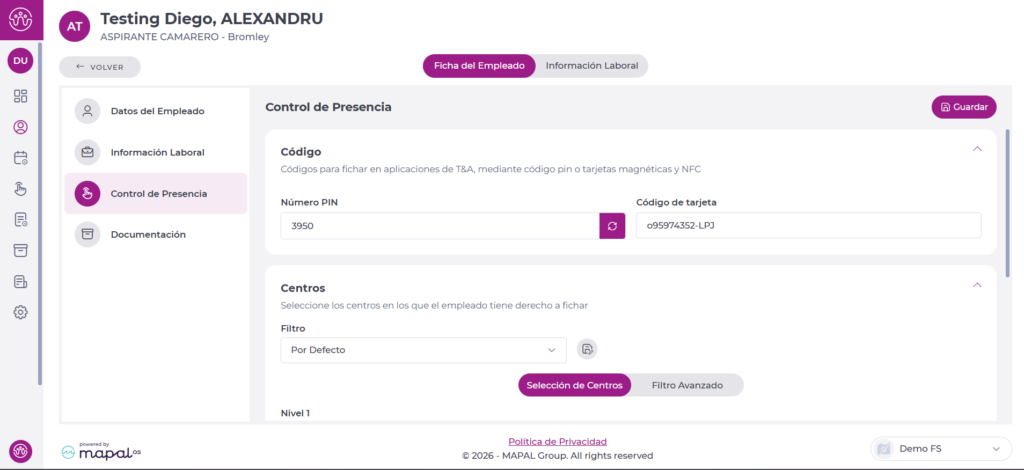- Marca los Centros donde el Empleado puede registrar asistencia.