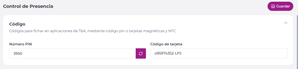 - Código de tarjeta: introduce o escanea el identificador de la tarjeta magnética o NFC asignada al Empleado.