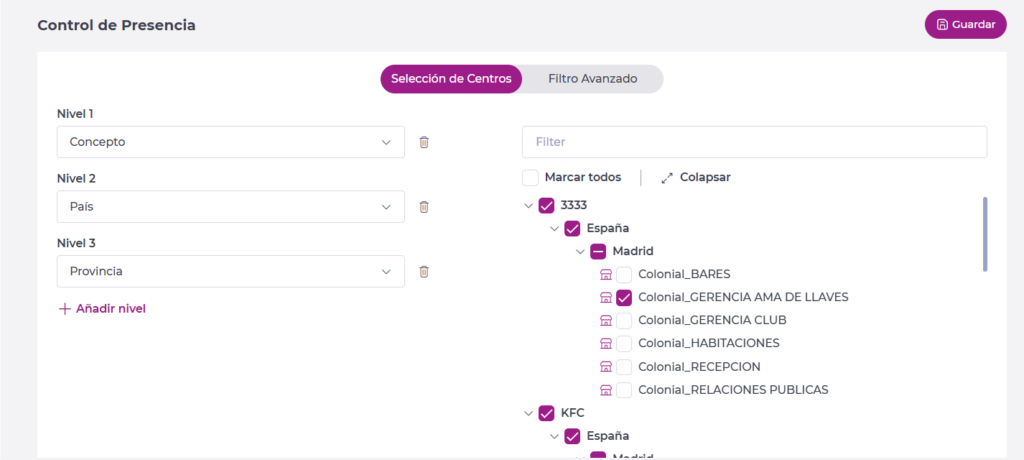 - Usa la pestaña Selección de Centros para elegir Centros manualmente, o usa Filtro avanzado para filtrar por país, concepto u otros niveles de jerarquía.
