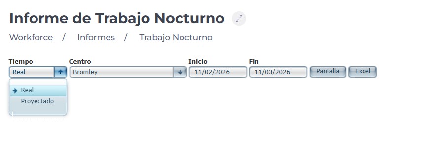 En el menú desplegable de Tiempo, selecciona si quieres ver el tiempo Real (según fichajes) o el tiempo Proyectado (según los turnos planificados).