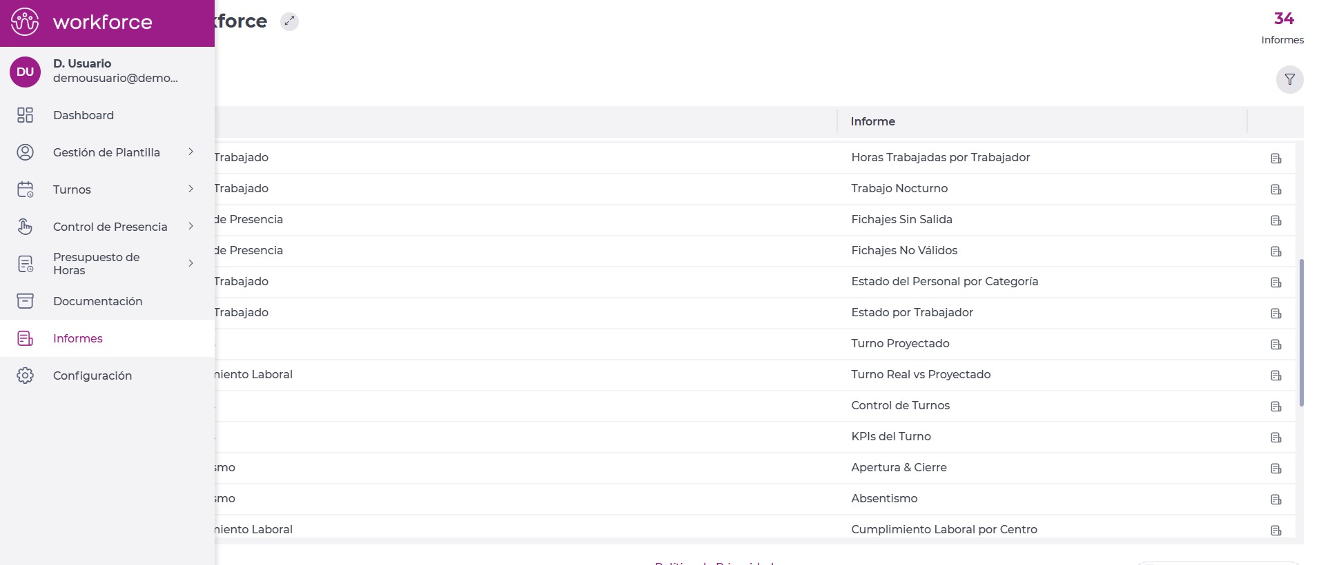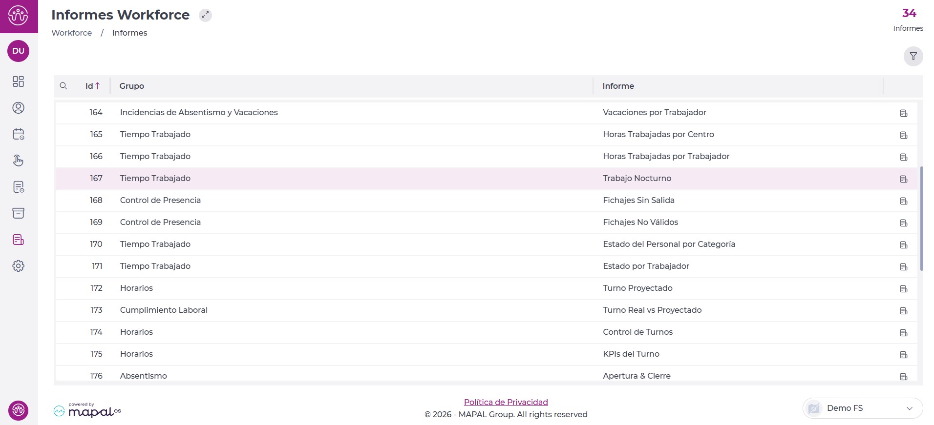 - Es posible utilizar la lupa para buscar el informe Tiempo trabajado – Trabajo nocturno (167) .