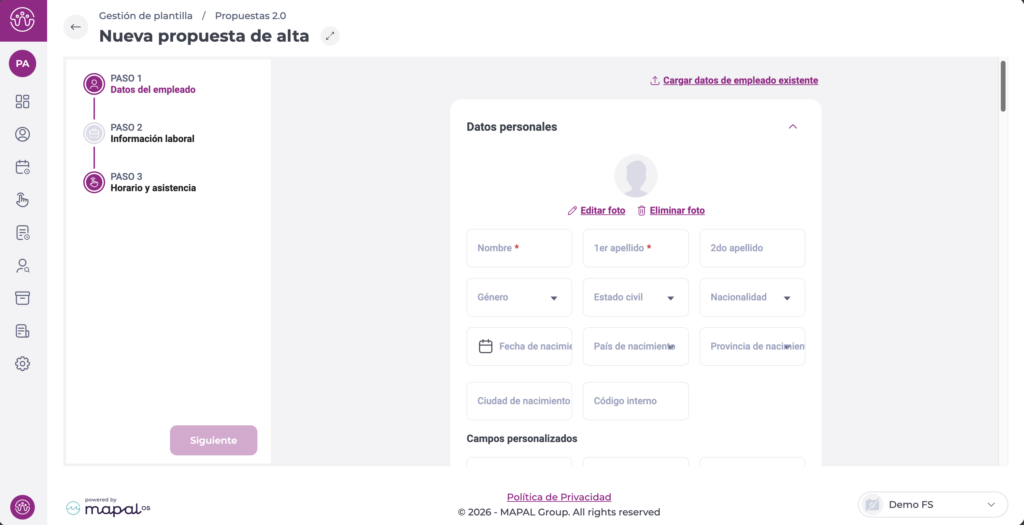 El formulario Nueva propuesta de alta se abre dividido en tres pasos: Paso 1: Datos del empleado, Paso 2: Información laboral y Paso 3: Control de presencia. Completa cada paso y selecciona Siguiente para avanzar. Los campos obligatorios están marcados con un asterisco (*).