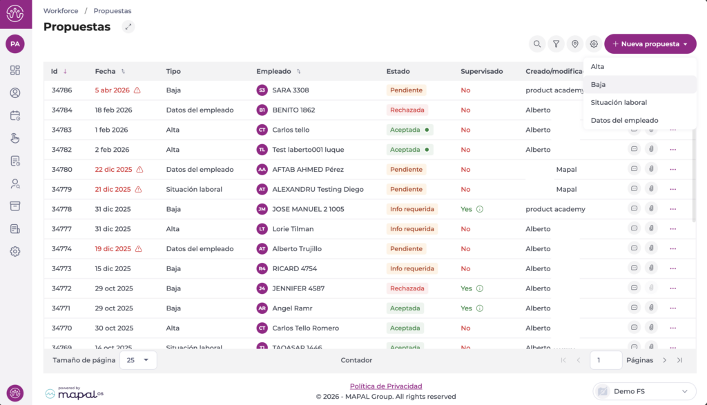 Una vez enviada, la propuesta aparece en la lista Propuestas con el tipo Baja y el estado Pendiente.