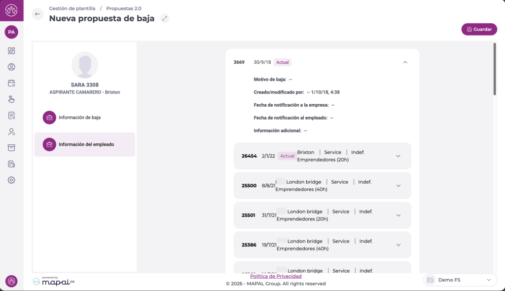 Una vez completada la información de baja, selecciona Guardar para enviar la propuesta.