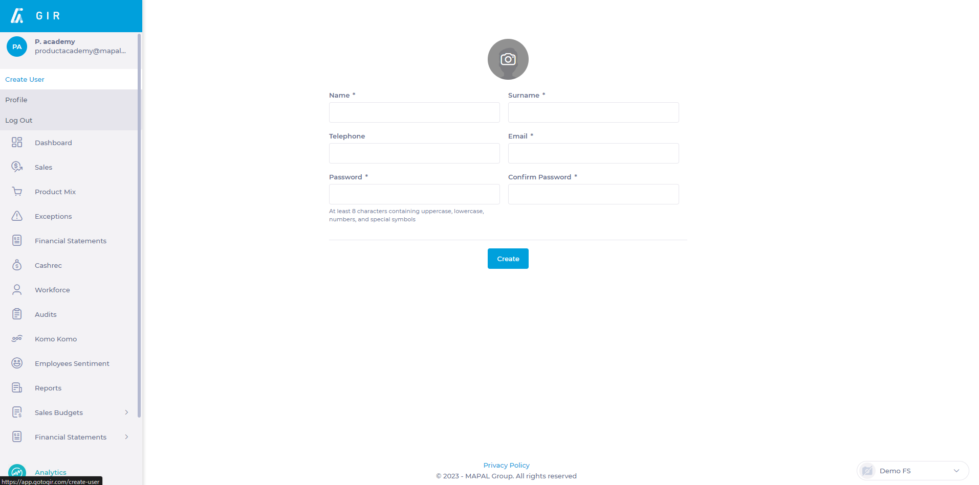 c. Correo electrónico: Te servirá como nombre de usuario para acceder a GIR y para recuperar la contraseña en caso de olvido. Además, funcionará como inicio de sesión de usuario para la aplicación móvil Workforce App.