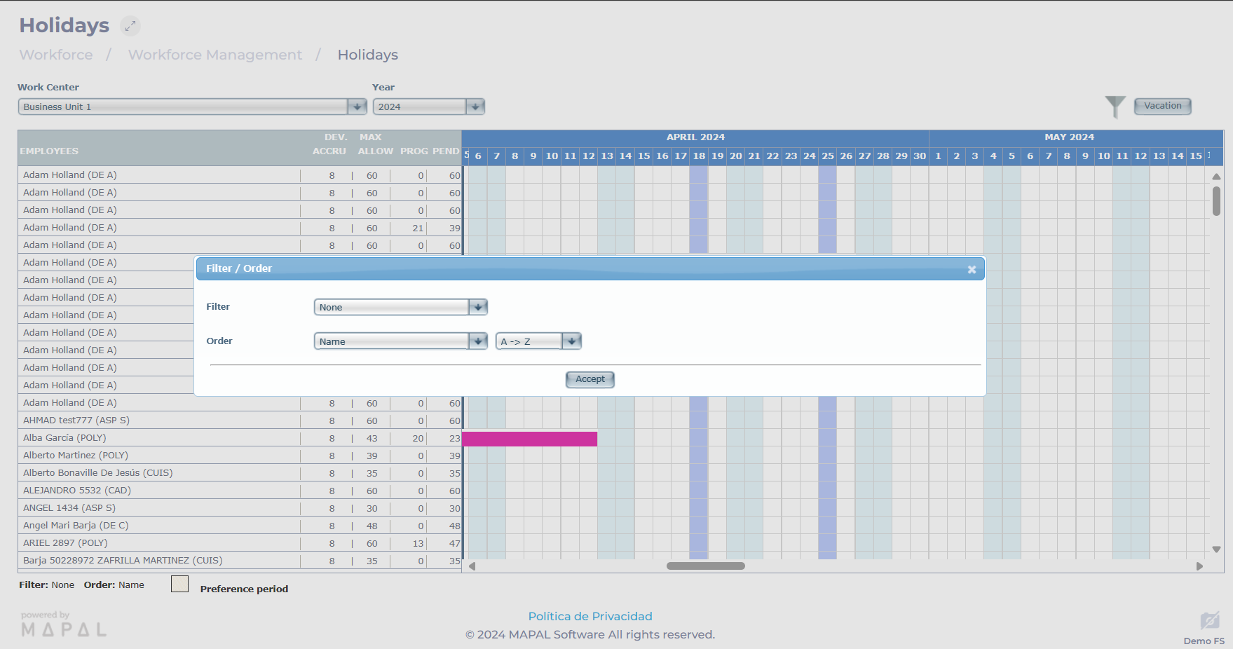 A través de la pantalla de Vacaciones (Plantilla > Vacaciones), los gerentes pueden identificar rápidamente las superposiciones de vacaciones. Esta pantalla, además, cuenta con una función de filtrado u ordenación que permite facilitar la vista de las vacaciones por nombres, contratos o puestos de trabajo.
