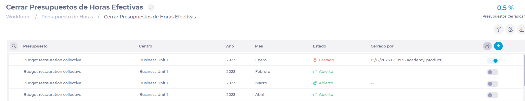Una vez que el presupuesto se haya cerrado, la casilla mostrará un indicador de Cerrado junto con la fecha, la hora y el Usuario que ha ejecutado el proceso.