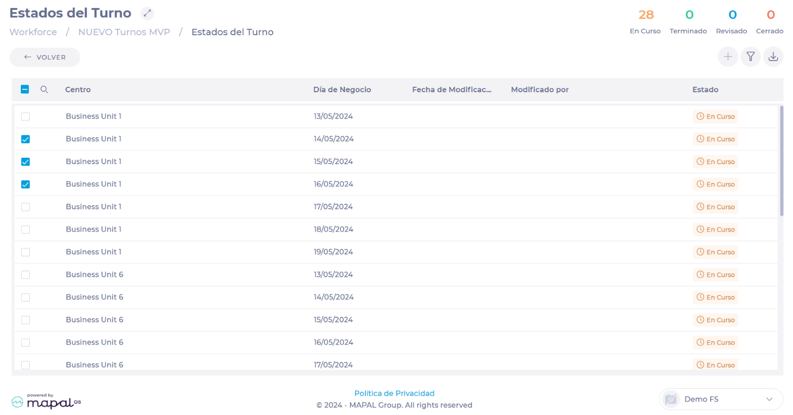 Selecciona el nuevo estado de los días seleccionados del menú desplegable, que puede ser En Curso, Terminado, Revisado o Cerrado.