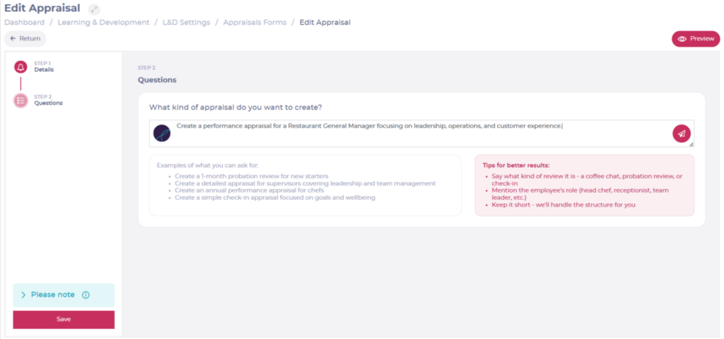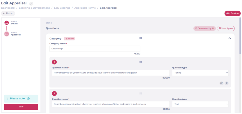 Note: AI-generated content is a starting point and should always be reviewed before the appraisal is published. You can combine AI-generated questions with manually created ones to build the final form.