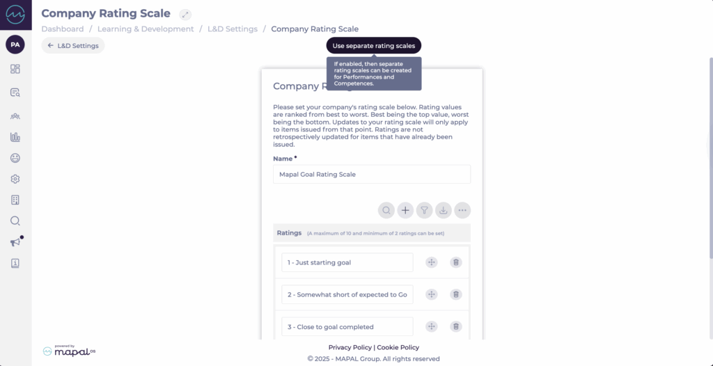 - To enable separate scales for appraisals and competences, select Use separate rating scales.
