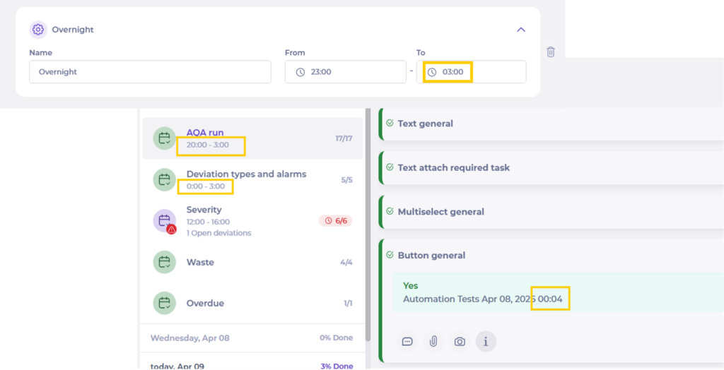 Les utilisateurs peuvent désormais configurer des créneaux horaire des checklists qui s’étendent au-delà de minuit, en cohérence avec les horaires d'ouverture des établissements. Le système évalue correctement le statut de réalisation des tâches sur ces périodes nocturnes.